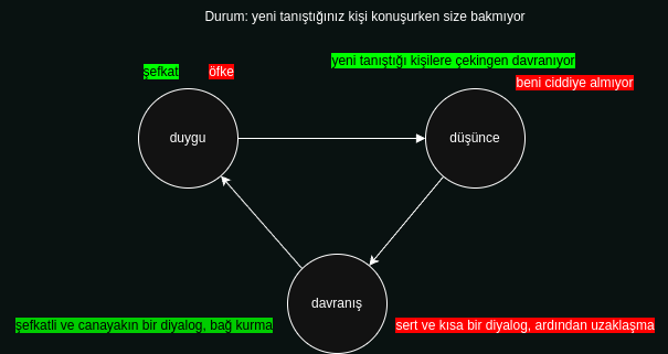 Gelecek yazılarda nihayet mutluluk psikolojisine gireceğim, her bir alt konuyu daha detaylı konuşuruz ama burada göreceğimiz örüntü şu: en büyük olay düşüncelerimizde. Mutluluk psikolojisinde de konu çok benzer bir yere bağlanıyor. Düşüncelerimiz duyguları, duygular davranışları tetikliyor. ve kendimiz, kendimizi hem iyilik hem kötülük girdabına çok rahat sokacak yeterlilikteyiz. Buradaki gücü negatif sarmala sarmamak için de profesyonel destekler (terapiler) düşünceleri değiştirmeye çalışıyor. Örneğin resimde yazdığım gibi konuşurken bize bakmayan birisine karşı iki farklı düşünce farklı duygu ve davranışları doğuruyor. Bunun ardından bir ATM’ye gidip uzun bir sıra olduğunu görüyorsak, öfkeliyken öfkemiz daha da artıyor, şefkatliyken ise örneğin beklerken telefonda şunları okuyacak bir fırsatım oldu diye düşünebiliyoruz. Bir çok kaynaktan beslensem de örneği de aldığım, terapi ekolünü tanırken en beğendiğim kitap bu linkte, Mind over Mood.